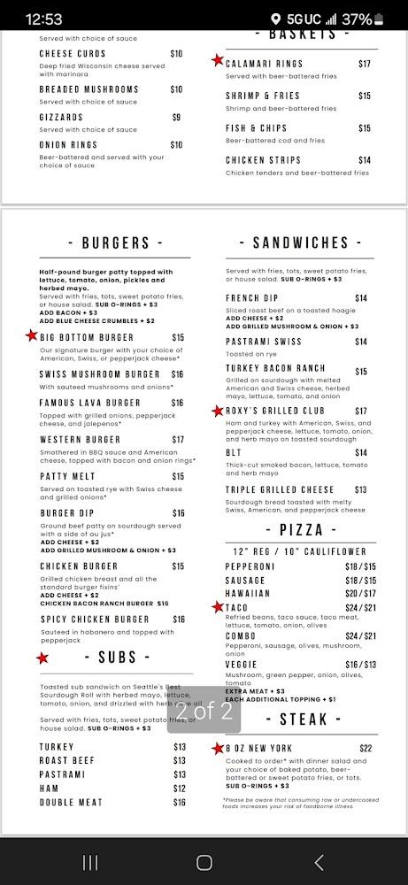 Roxy's menu boasts an impressive array of dishes, highlighting classic American flavors. From burgers like the Swiss Mushroom Burger to a selection of hearty sandwiches, there’s something for everyone. Starters include crispy tater tots and mozzarella sticks, perfect for sharing.